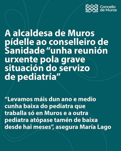 ✍️ Nunha carta enviada ao conselleiro, a alcaldesa móstralle “a miña preocupación pola grave situación que temos, xa que levamos máis dun ano e medio cunha baixa de longa duración do pediatra que traballaba só en Muros”.