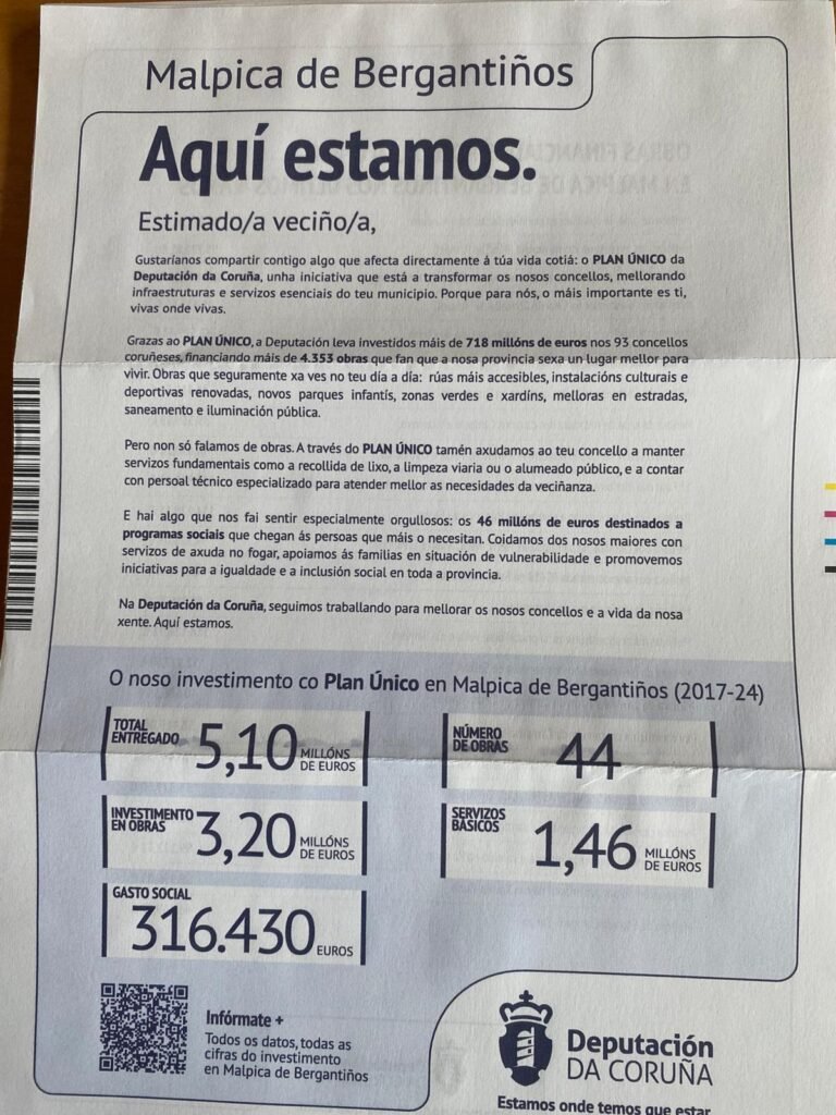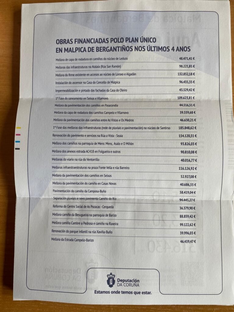 O Plan único da Deputación de A Coruña deixou un investimento de 3,20 millóns de euros en obras e 1,46 millóns de euros en servizos básicos. Un total de 44 obras han sido realizadas grazas a aportación económica da deputación da Coruña presidida por Valentín González Formoso de PSdeG.