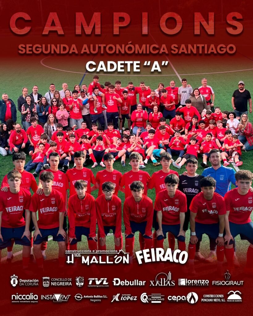 A canteira da SD Negreira volve dar unha alegría inmensa á súa afección. O equipo cadete proclamouse esta xornada campión de Liga, acadando ademais o ansiado ascenso a Primeira Futgal Cadete, nunha tempada que xa queda gravada con letras de ouro na historia do club.