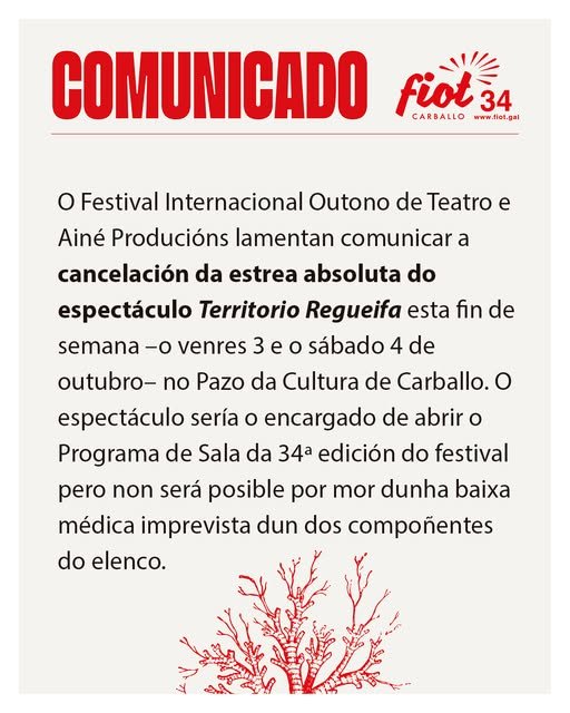 Cancelación das funcións de ‘Territorio Regueifa’ previstas no #FIOT34 este venres 3 e sábado 4 de outubro por mor dunha baixa médica imprevista dun dos compoñentes do elenco.