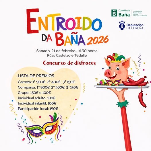 O Concello da Baña, a través da Concellería de Acción social, cultura e servizos á cidadanía, organiza o 🗓️𝐬𝐚́𝐛𝐚𝐝𝐨 𝟐𝟏 𝐝𝐞 𝐟𝐞𝐛𝐫𝐞𝐢𝐫𝐨 o 🎭𝐂𝐨𝐧𝐜𝐮𝐫𝐬𝐨 𝐝𝐞 𝐃𝐢𝐬𝐟𝐫𝐚𝐜𝐞𝐬 𝐝𝐨 𝐄𝐧𝐭𝐫𝐨𝐢𝐝𝐨, unha cita que promete converter as rúas Castelao e Tedelle nun auténtico fervedoiro de festa ⌚𝐚 𝐩𝐚𝐫𝐭𝐢𝐫 𝐝𝐚𝐬 𝟏𝟔.𝟑𝟎 𝐡𝐨𝐫𝐚𝐬.