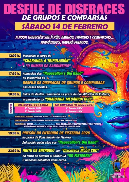 Tanto se sodes un GRUPO de amigos, unha familia… (de 3 a 14 persoas) ou unha COMPARSA (15 ou máis persoas), non perdades a oportunidade de encher as rúas de Fisterra de cor, música e diversión no Desfile de Entroido o sábado 14 de febreiro.