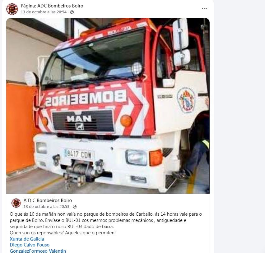 Segundo indican os bombeiros, ás 10:00 horas non estaba dispoñible o BUL-03 no parque de Boiro, e posteriormente, ás 14:00 horas, entrou en servizo o BUL-01, non sen antes advertir da situación deficiente do vehículo.