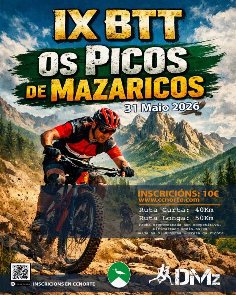 O vindeiro 31 de maio de 2026, volta a nosa cita coa bicicleta de montaña. Xa está aquí unha nova edición da BTT Os Picos de Mazaricos!