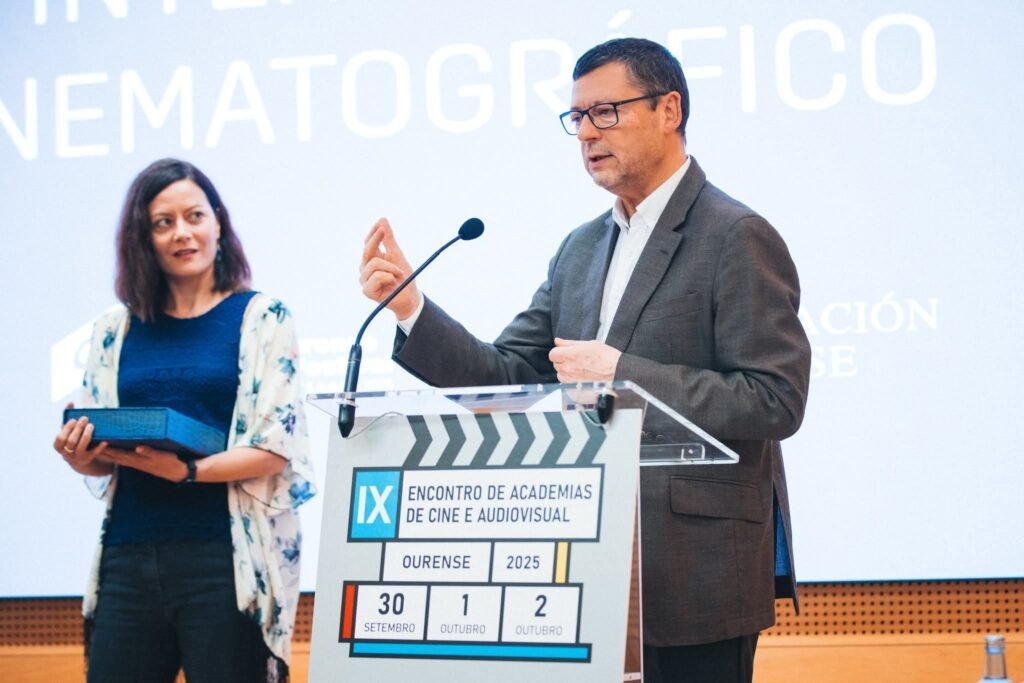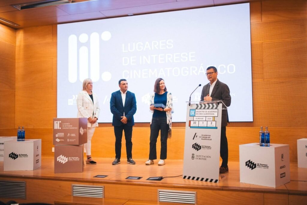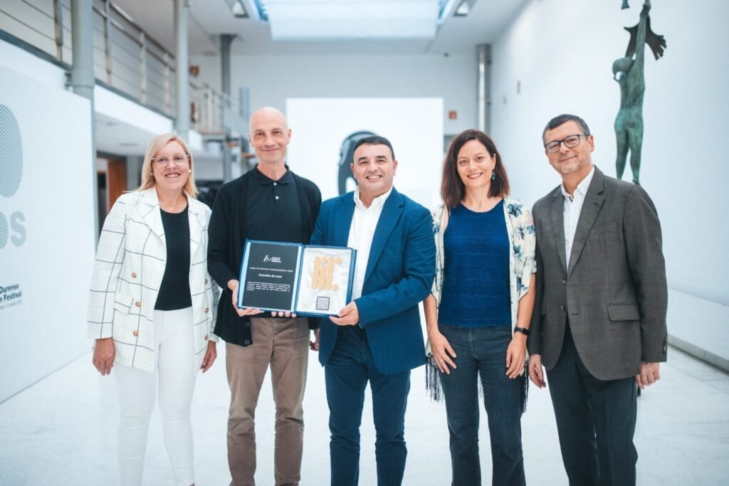 O alcalde Paco Charlín e a concelleira de Cultura Raquel Lema recolleron este importante galardón en Ourense, no marco do IX Encontro de Academias de Cine e Audiovisual da Península Ibérica, organizado pola Academia Galega do Audiovisual.