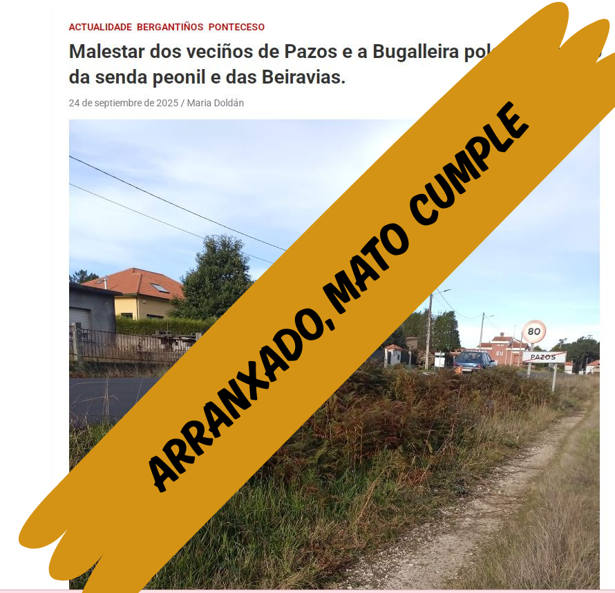 Fai 2 días nos faciamos eco dunha queixa da veciñanza e viandantes de Pazos e da Bugalleira e hoxe podemos informar que o Sr Alcalde mandou cortar a maleza na senda e nas Beirarrúas. Noraboa o Alcalde de Ponteceso pola rápida resposta.