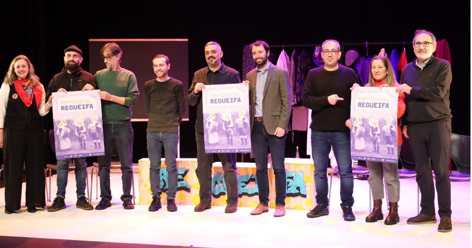 Territorio Regueifa chega ao Pazo da Cultura o venres 6 de febreiro da man do FIOT (Festival Internacional Outono de Teatro), despois de que o espectáculo tivera que adiarse pola baixa dun dos seus protagonistas. O festival, o Centro Dramático Galego e Ainé coproducen unha inédita e ambiciosa proposta escénica que pon en valor este xénero artístico. Para presentar esta peza teatral estiveron no Pazo da Cultura o director do espectáculo, José L. Prieto, e os intérpretes Manolo Maseda, Lupe Blanco y Josinho da Teixeira, que estiveron acompañados polo director do FIOT, Alberto Sueiro; o alcalde de Carballo, Daniel Pérez; a concelleira de Cultura e Festas do Concello de Carballo, Maruxa Suárez; e polo director do Centro Dramático Galego, Fran Núñez.