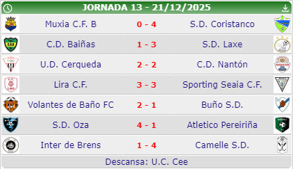 Pola zona baixa destacar a victoria do Camelle en casa do Colista Inter de Brens 1-4 e a Victoria do Laxe 1-3 en casa do Baiñas.