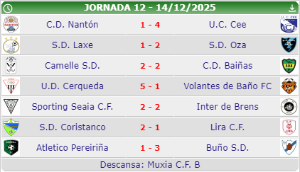 Destacar a victoria do Cee 1-4 en casa do Nantón , do Buño na súa visita a o campo do Pereiriña 1-3 e do Cerqueda en Casa cunha goleada 5-1 ante o Volantes de Baño.