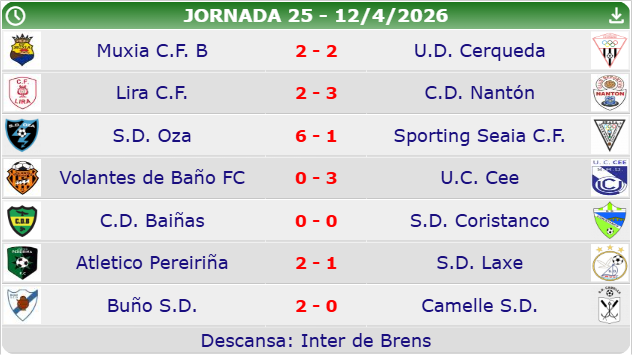 Na loita polos postos altos tamén destacaron as vitorias do Cee, que sumou tres puntos importantes tras vencer por 0-3 ao Volantes de Baño, e do Buño, que se impuxo por 2-0 ao Camelle nun partido serio e ben traballado.