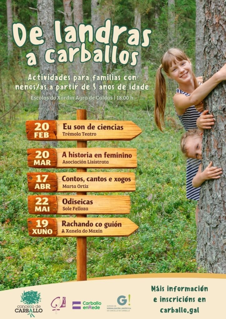 As concellarías de Igualdade e Normalización Lingüística presentan a nova edición do programa De landras a carballos, unha iniciativa pensada para reunir actividades culturais, educativas e lúdicas dirixidas ás familias e a infancia na fase entre os 5 e os 11 anos. O ciclo estenderase de febreiro a xuño, e desenvolverase nas Escolas do Xardín Agra de Caldas, sempre ás 18.00 horas.