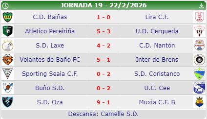 Destacar a victoria do Laxe 4-2 ante o Nantón e tamén a victoria do Atletico Pereiriña 5-3 contra o Cerqueda.