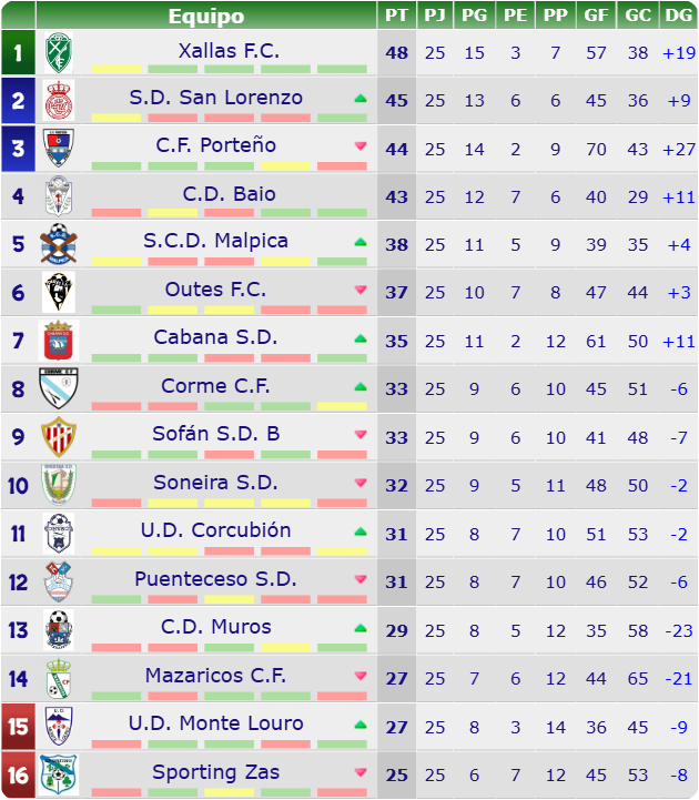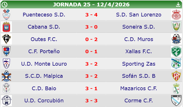 Na zona baixa da clasificación tamén houbo movementos importantes. O Monte Louro abandona o último posto tras vencer (3-2) ao Sporting Zas nun duelo directo pola permanencia. Este resultado deixa ao conxunto de Zas como novo pechacancelas da táboa.