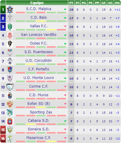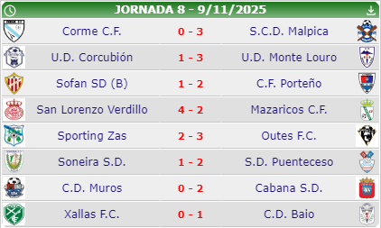 A segunda futgal da costa esta sendo unha montaña rusa, o Xallas perdeu maís co liderato ante o Baio que puxose segundo na táboa e o cuadro Xalleiro baixou a terceira posición. No municipal da Fontela o Baio gañou 0-1, O Malpica e o novo líder e equipo revelación do campionato, Gañou 0-3 na súa visita a Corme.