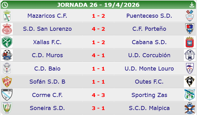 Pola parte baixa, o Monte Louro sumou un punto importante no campo do Baio, mentres que o Muros logrou unha valiosa vitoria por 4-1 ante o Corcubión, clave na loita pola permanencia.