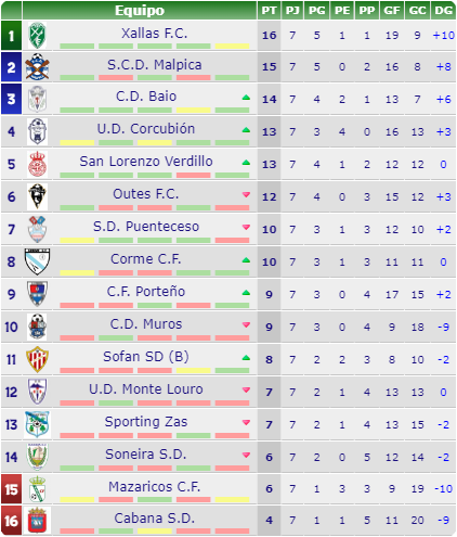 O Malpica gaña o Sporting Zas por 2-1 , o Baio poñese 3º cunha victoría abultada 4-0 ante o Soneira, O Corcubión e o San Lorenzo seguen no alto da taboa grazas a sendas victorias pola mínima ante o Outes e o Monte Louro pola Mínima.